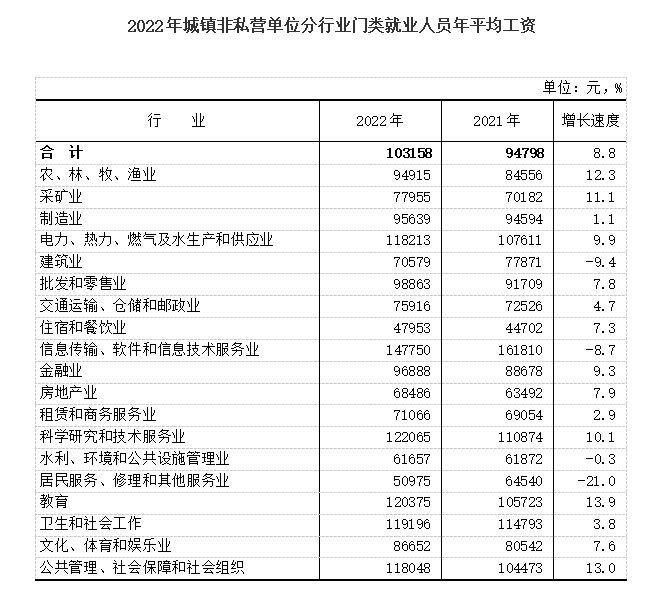 2022年三明市城镇非私营单位就业人员年平均工资为103158元,增长8.8%。在岗职工(含劳务派遣人员)年平均工资为108344元,增长9.1%。