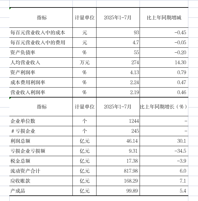 2025年1-7月三明市规模以上工业经济效益主要数据